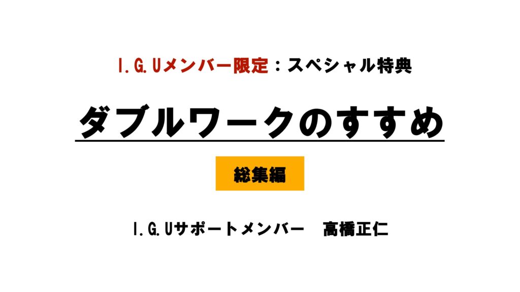 こんばんは、高橋正仁です。 本日は私からI.G.Uメンバーに向けて ダブルワークの総まとめとなるスペシャル特典 「ダブルワークのすすめ」 をお届けします。 この一か … 続きを読む ダブルワークのすすめ